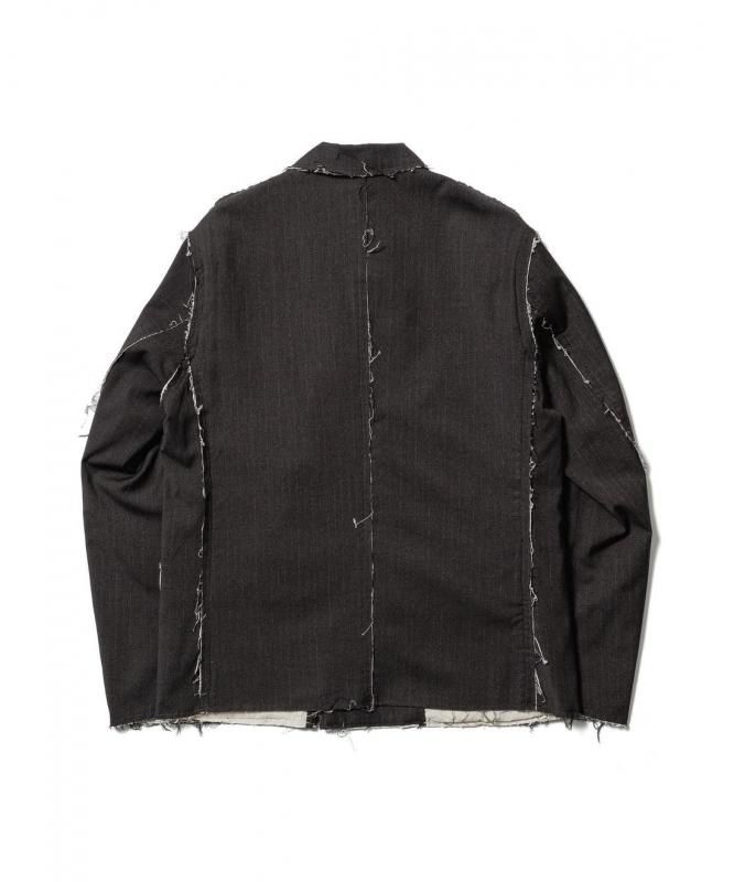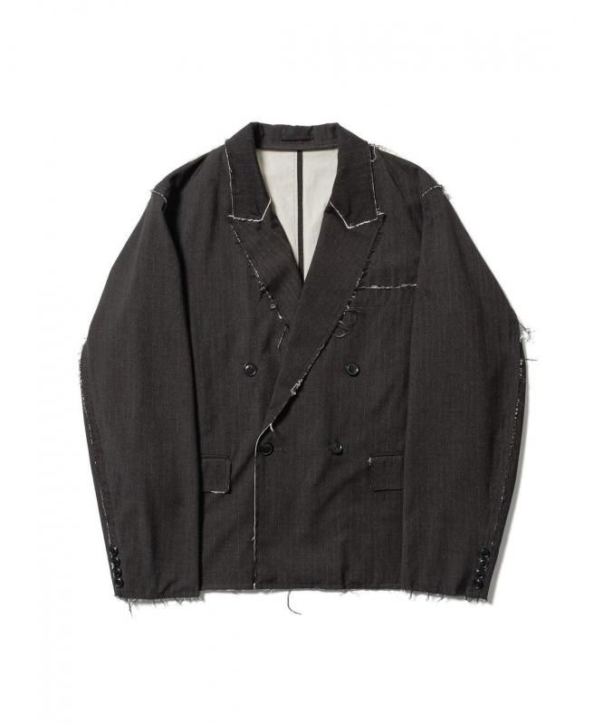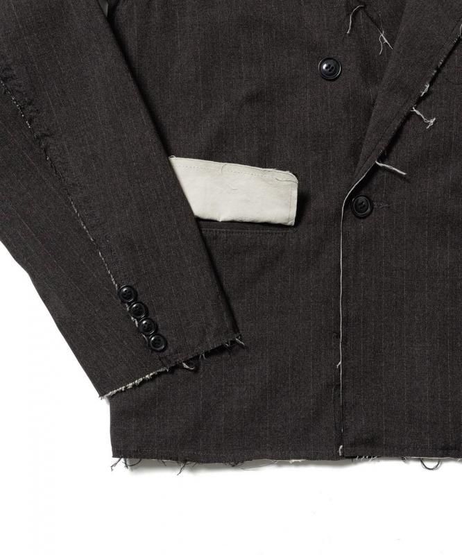 ・スーツ仕立て後に,衿、アームホール、袖先、裾等の糸を手作業で解き、さらに洗い加工を入れることにより他には無い風合いを表現。