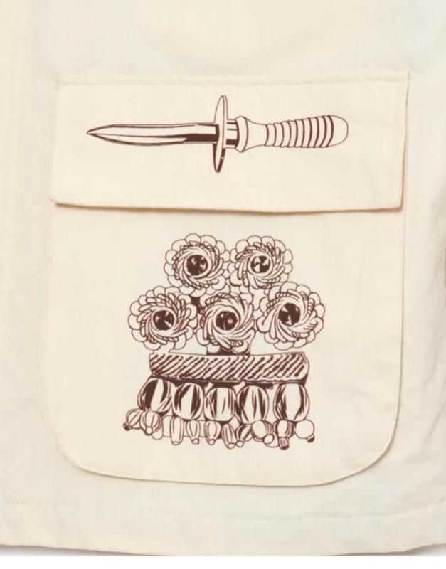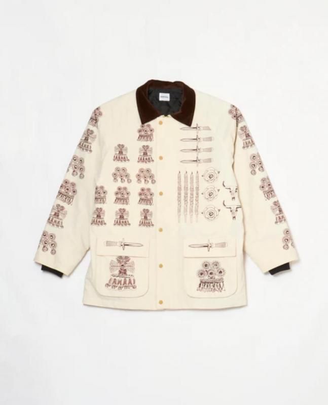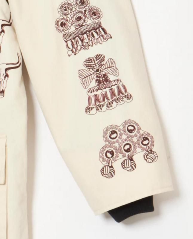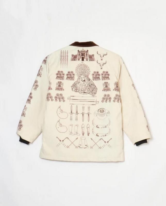 伝統的な闘牛の道具を全面にプリントした着用する伝統衣装のモチーフをプリントしたMatador tools coat。