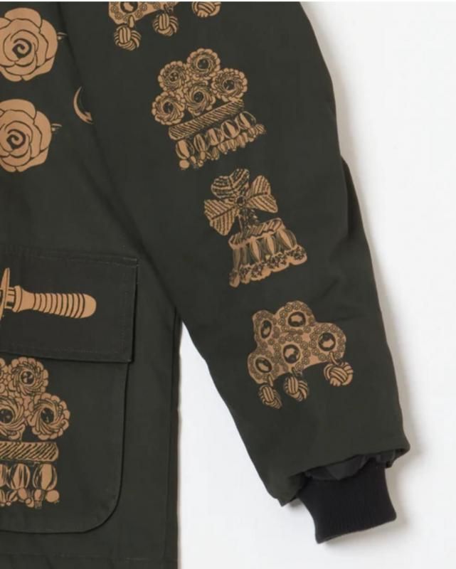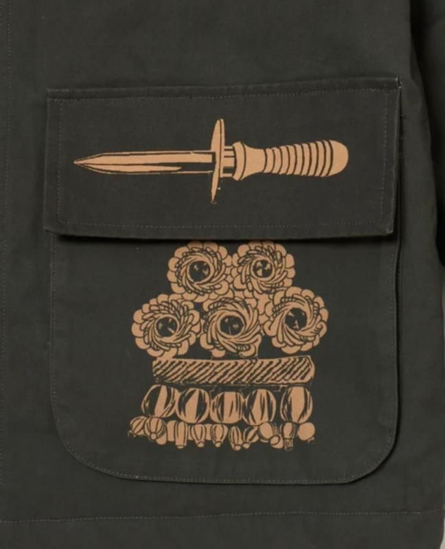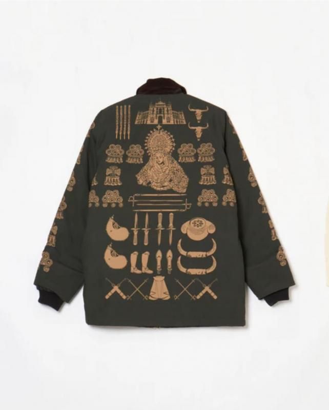 伝統的な闘牛の道具を全面にプリントした着用する伝統衣装のモチーフをプリントしたMatador tools coat。