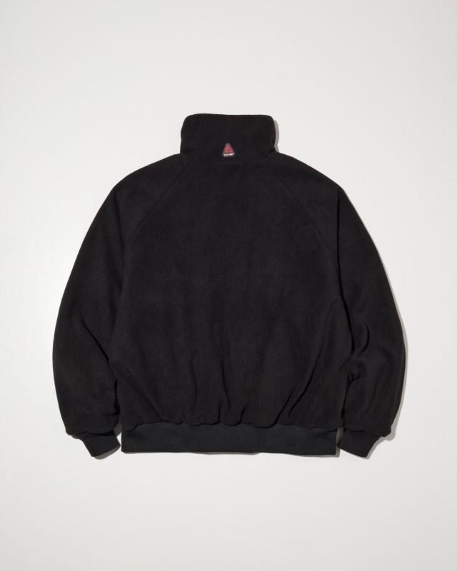 フロントリバーシブルファスナーにロゴ入り織りネーム付き引き手、フリース面の襟裏にワッペン付き。