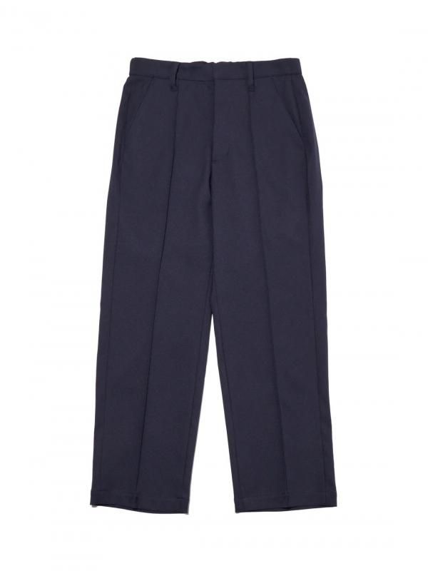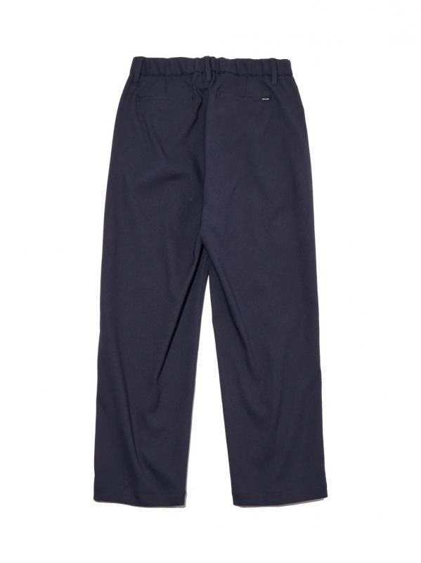 ポリエステル/ポリウレタン混紡のピンタックパン ツ。ウエストにゴムを配置、ベルトループが付属するデ ザイン。両サイドにスラッシュポケット、玉縁のヒップ ポケット、フロントファスナーを付属。ワタリ、ヒップ、 裾幅にゆとりのあるシルエット。